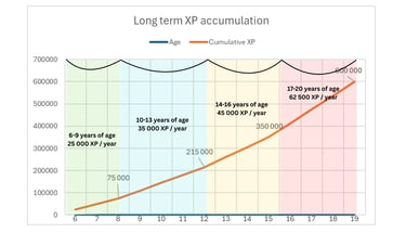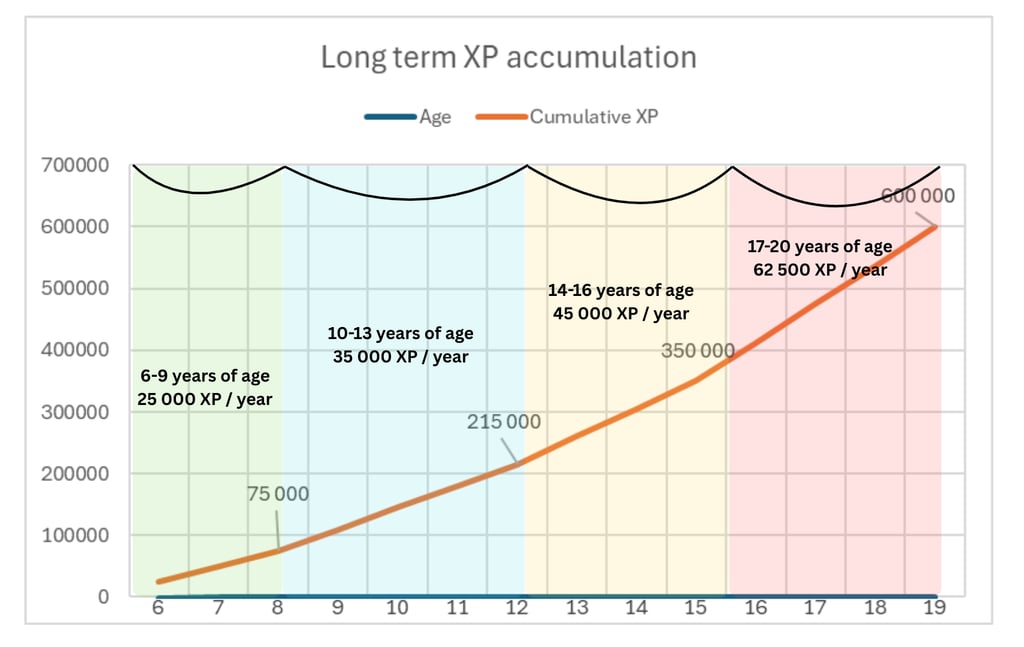 🔹 By age 10, a player can reach ~75,000 XP — the first milestone on the road to mastery.